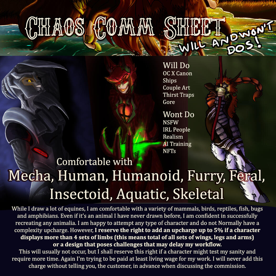**By purchasing or acquiring any art or design I have made the client or clients -referred to in these Terms of Service as "the client", consumer, customer, you, your, and/or yourself- are agreeing to these terms of service of the seller- referred to in these Terms of Service as "the seller", Mystic Mahogany Studios, choasblast03, cowgirlknight, I, me, mine, my, and/or myself. This agreement is considered binding regardless of how it was acquired.**The phrase "art or design I have made" when stated within these Terms of Service includes but is not limited to the following products when made or are in the process being made by myself: Adopts, Customs, Character designs, redesigns, gifts, line arts, reference sheets, artwork, Works-in-Progress, sketches, and concept pieces.**The phrase "art I have made" when stated within these Terms of Service includes but is not limited to the following products when made or are in the process being made by myself: gifts, line arts, reference sheets, artwork, Works-in-Progress, sketches, and concept pieces.**The phrase "design I have made" when stated within these Terms of Service includes but is not limited to the following products when made or are in the process being made by myself: Adopts, Customs, Character designs, and redesigns.**The phrase "regardless of how it was acquired" applies to but is not limited to the following methods of acquisition for any art or design I have made: commissioned, gifted, traded, purchased, included, transferred, resold, re-traded, re-gifted, recycled, illegal acquisition, downloaded, digitally copied, photo-copied, emailed, sent, received, video recorded, screen-captured, printed, photographed, scanned, faxed, telegrammed, encrypted, decrypted, translated, viewed, clicked, tapped, long pressed, swiped, picked up, lifted, handled, injected, and consumed.Failure to abide my Terms of Service will result in a Blacklisting!Design Resale pricing: You may not resell any design I have made for more than their initial sale cost (Set by me, the design creator) Unless the design has additional art acquired after the initial purchase. This policy holds for designs I have made regardless of how it was acquired.Art and/or Design Ownership Changes: If any art or design I have made is going to be acquired by a new owner at your discretion be sure my Design Crediting and/or Toyhouse Crediting is not lost or missing, as this could result in you and/or the new owner becoming blacklisted by failing to maintain compliant to my Design Crediting and/or Toyhouse Crediting Terms of Service. This policy applies to any art or design I have made regardless of how it was acquired.Design Crediting: Any art or design I have made must be credited to me as Choasblast03 or Mystic Mahogany Studios. Any art or design I have made should be linked back to either @choasblast03 on Instagram, and/or @cowgirlknight on Deviantart.Toyhouse Crediting: If you put any art or design I have made on Toyhouse, it must be credited directly to my Toyhouse account Choasblast03, do NOT link design/art credit on Toyhouse to my DA, Instagram, or Discord.Alterations/Edits: You may not draw on or edit any art I have made unless my explicit permission is acquired.